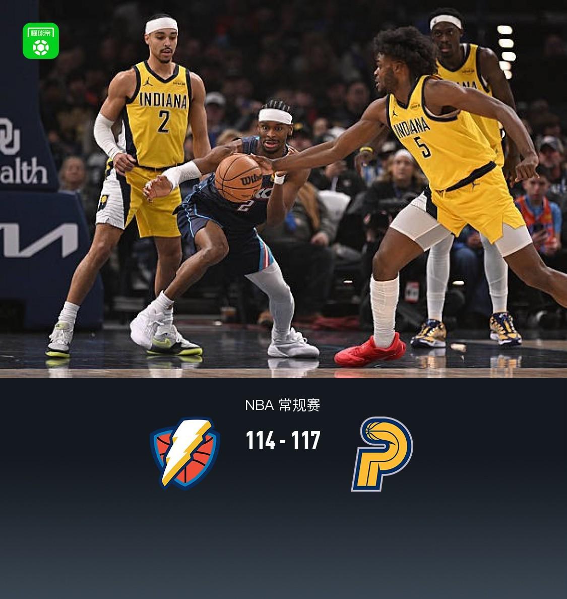 第四节雷霆亚历山大拿下15分,步行者内姆布哈德拿下9分,最终雷霆114-117不敌步行者